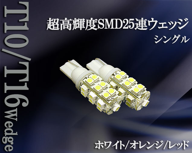 超高輝度 SMD T10/T16 ウェッジ 25連SMD超高輝度LED 2個セット価格: 2,980円レビュー評価: 4.67 レビュー数:3 T10/16 超高輝度SMD25連ウェッジシングル 1セット2個入り ホワイト/オレンジ/レッド◇最新の高輝度SMDを前方に1個・側面に24個を配置。 今までに無い明るさと拡散性を実現しました。 ハロゲン球クラスの超広角仕様になっております。◇色温度:約5500?6000K◇ドレスアップに最適で、HIDとの相性にも優れています。 ※画像では実際の色合いと異なる場合もございますので予めご了承下さい。◇参考取付位置: ポジション、サイドウインカー、ナンバー灯等。◇SMDとは・・・ SMD(Surface Mount Device):表面実装技術でプリント基板 (電子部品用の配線を施した基板)の表 |