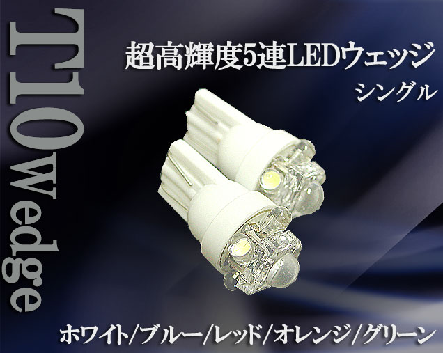 高拡散型!!おすすめ品全方向拡散対応 T10 5連LEDバルブ ウェッジ型 2個セット 白/青/緑/赤/橙 【メーターパネル・ポジション・他】価格: 1,280円レビュー評価: 3.9 レビュー数:10 T10 超高輝度5連LEDウェッジシングル 1セット2個入りホワイト/ブルー/レッド/オレンジ/グリーン◇超高輝度・超拡散5連LED使用。◇中央に高輝度のFLUX(高密度LED)を1つ、サイドに高輝度LEDをそれぞれ90度間隔で 4個横方向に配置されています。 リフレクターを活用することを前提に作られた全方向カバー型バルブです。 ◇参考取付位置: ポジション球・メーターパネル球・コックピットパネル球・バックランプ・ライセンス球・ ルームランプ球・ウインカー球仕様 汎用タイプですので、取り付け車種・箇所のサイズとソケットが合えば取り付け可能です。サイズ、ソケット形状はご購入前にご確認ください |